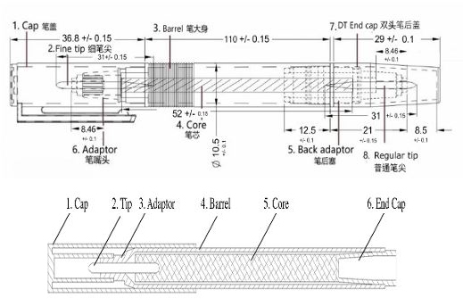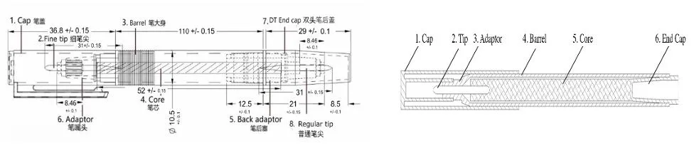 一次使用無菌皮膚記號筆由筆蓋、筆尖、筆嘴頭、筆大身、筆芯、筆後蓋、墨水(含龍膽紫、異丙醇、丙二醇、水)組成,另有可選擇的軟尺和不干貼紙(根據型號而定)。